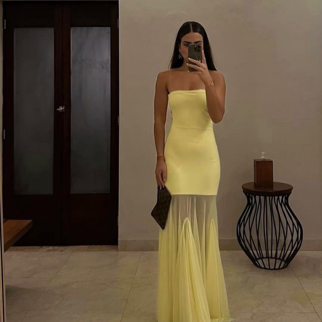 Trendylonguerobesirènejaunebustieravecuneffetsemi-transparentsurlebasdelajupe